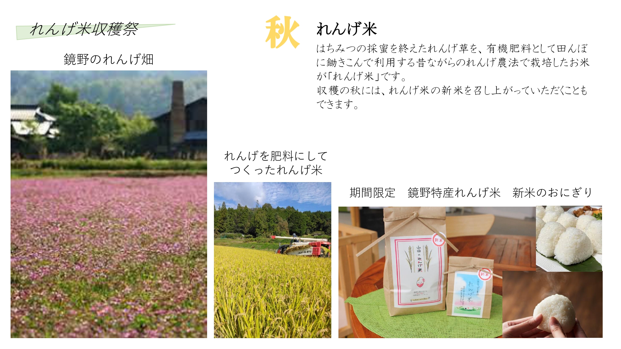 そんな四季の恵みをギュッと詰め込んだ「れんげ米」で、収穫を祝うイベントを開催します。